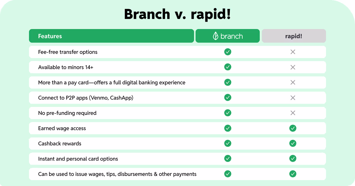 Both Branch and rapid! offer a fast, digital pay solution for employees, but there are key differences between our solutions. Most notably, the Branch Card is a debit card for employees, while rapid! is a traditional pay card.