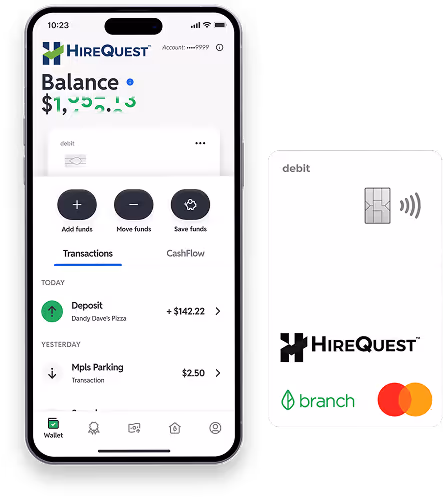 Branch helps staffing firms like HireQuest streamline the entire payment process, cut operational drag, and deliver a faster, more flexible experience for workers. From day one, they can sign up for a digital wallet and access their pay right away—no pre-funding, no paper checks, no delays.