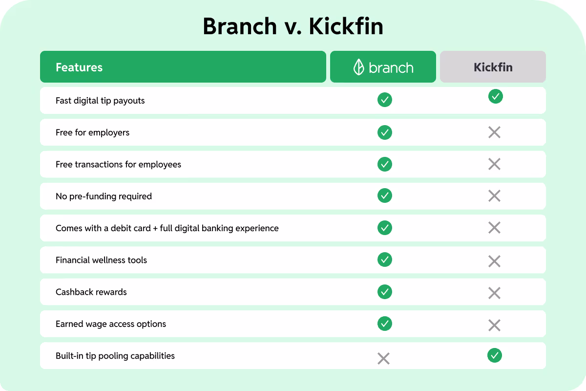 Kickfin is a tip management platform, so tip payouts are their only focus. Branch is a workforce payments platform with multiple capabilities, including tip payouts.